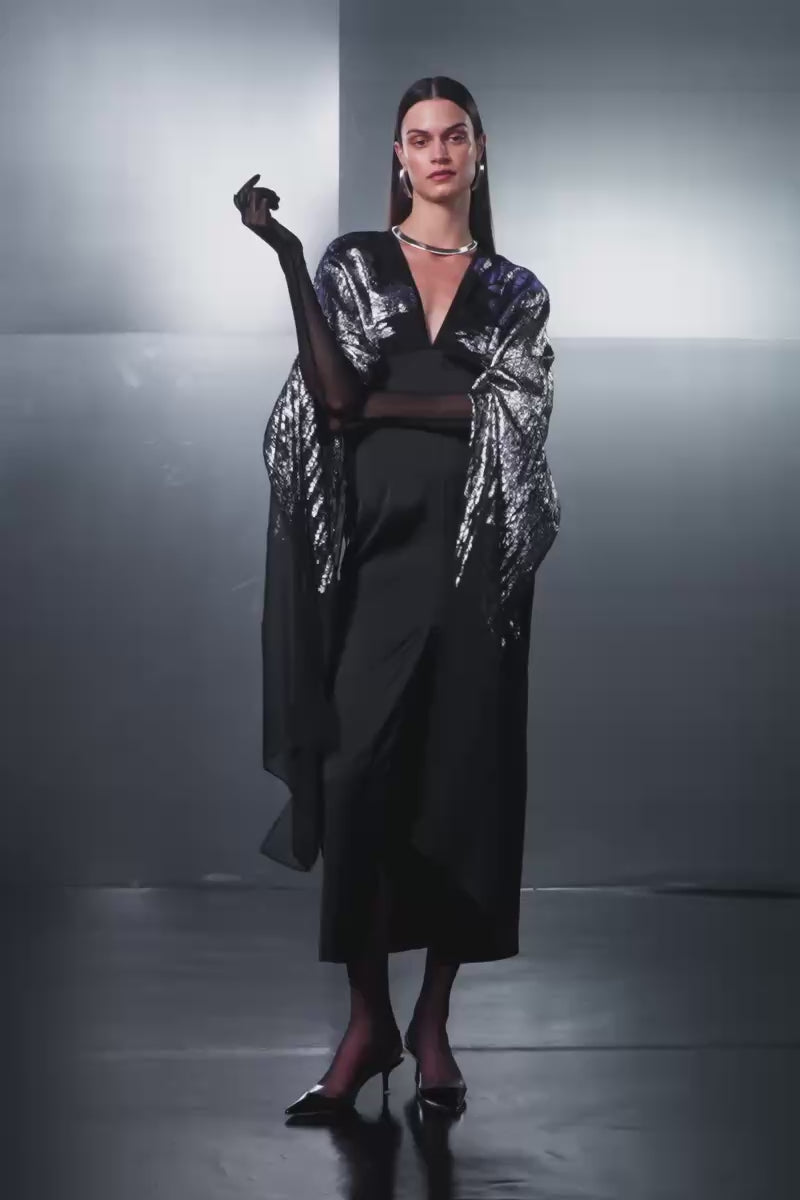 Aquila is a dramatic dress that merges celestial fantasy with sharp tailoring. Its deep V-neckline and sculpted waist create a statuesque silhouette, while the sheer, metallic sleeves cascade like stardust in motion. The ombré shimmer evokes the twilight sky, turning each gesture into a performance. Lightweight yet impactful, Aquila is designed for those who move like constellations and dress with intention.