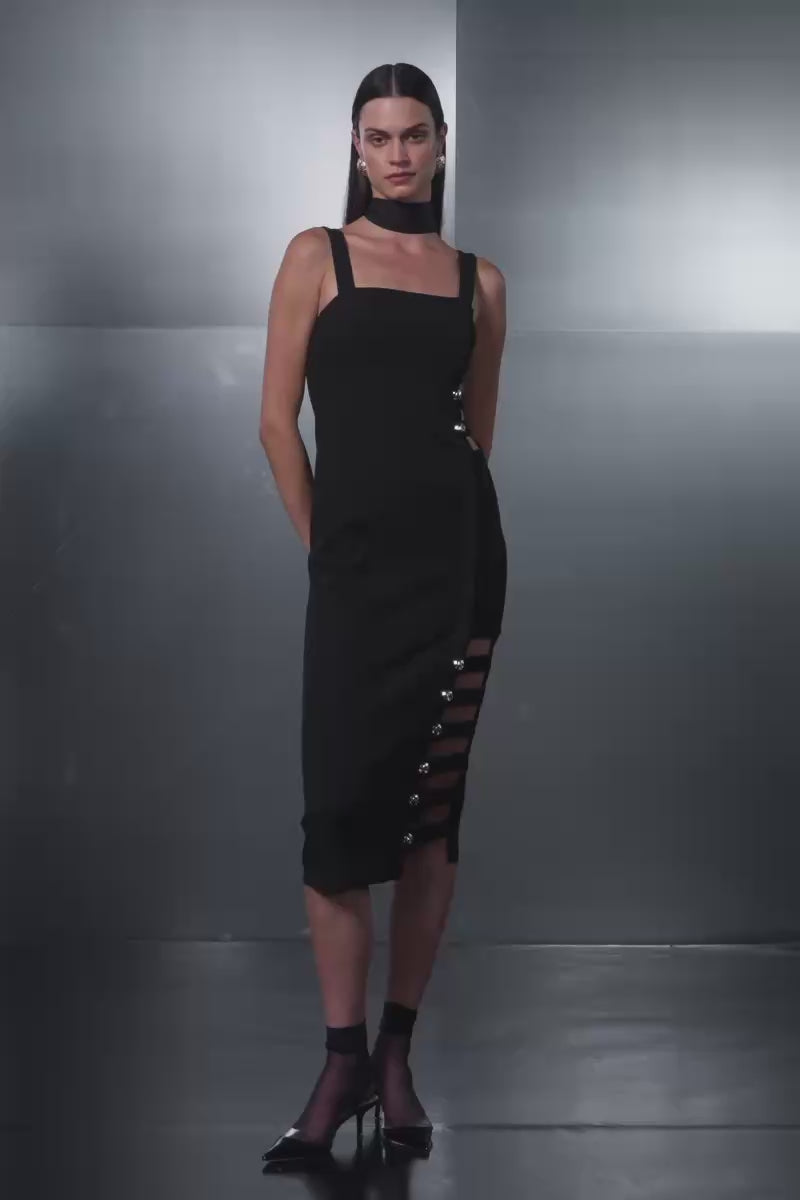 The Lucida Dress is a bold expression of structured sensuality. This form-fitting design features striking cut-outs along the side, accentuated with gold embellishments for a touch of opulence. A sleek silhouette and adjustable straps ensure the perfect fit, making it the ultimate dress for an unforgettable night.