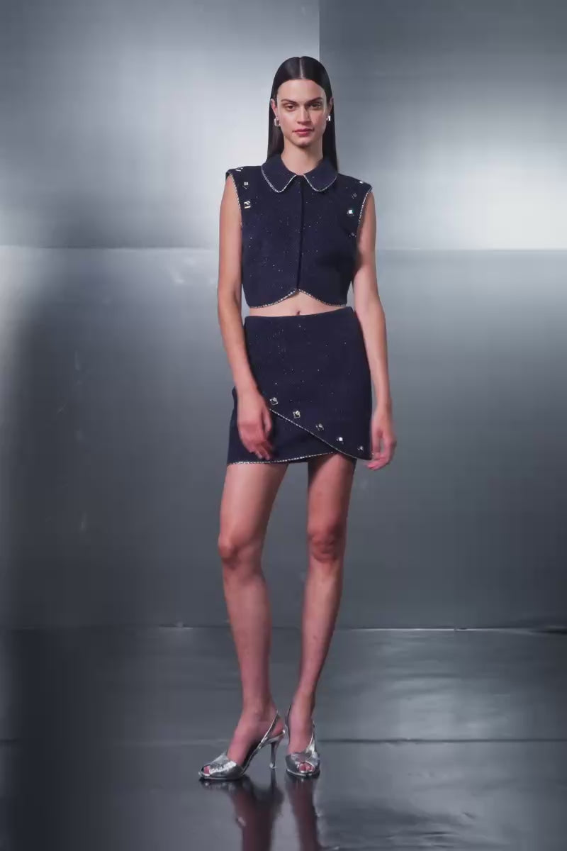 A structured yet playful take on eveningwear, the Meissa Skirt is adorned with shimmering accents and diagonal embellishments. The deep navy hue and asymmetrical wrap-effect silhouette create a sleek and modern look.