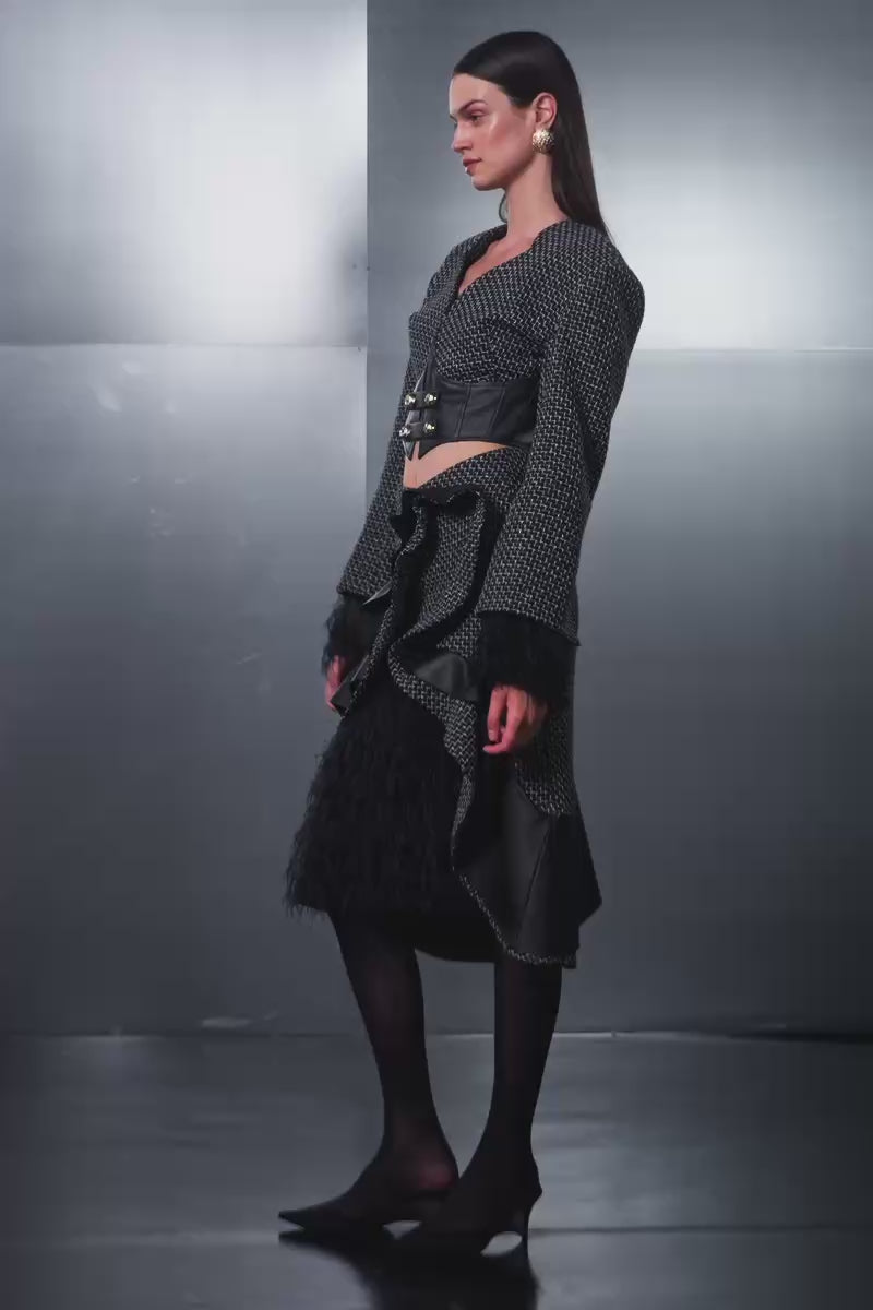 Nycus Top is a cropped showpiece with sharp feminine force. Its rounded shoulders and sculpted neckline are anchored by a corset-style panel that cinches the waist with military precision. Feather-trimmed sleeves and gilded buttons inject drama and opulence. Worn alone or as a set, it commands attention with a polished yet wild energy.